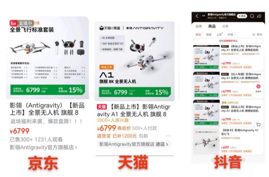 影翎A1作为影石创新旗下Antigravity品牌推出的全球首款全景无人机,于2024年12月4日正式发售,定价6799元起。然而,其市场反响远不及预期,发售4天时间,全电商平台总销量约1000多台,与供应商透露的“几十万台销售目标”形成巨大反差。母公司影石创新股价应声大跌两天,12月5日收盘价下跌6%,12月8日早盘,截至发稿,股价跌超5%。